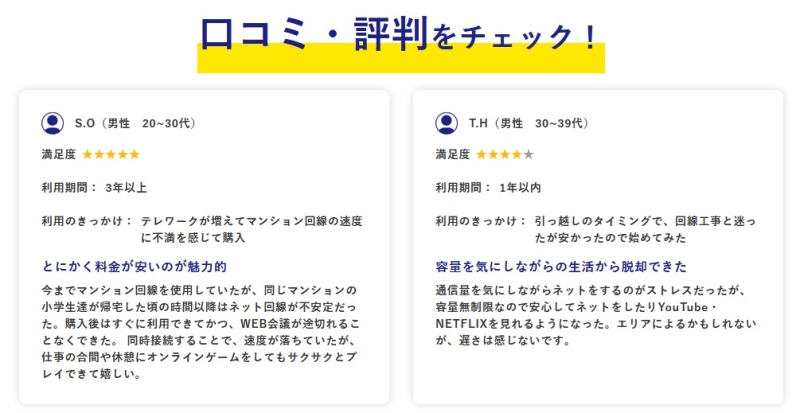 「転勤が多いけど、工事がいらないから助かる」「設置場所を変えてもすぐ繋がった」という意見も。