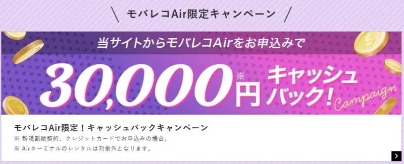 モバレコAirの魅力は、やはりこの30,000円キャッシュバック。