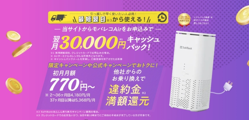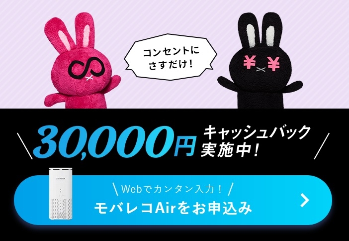 モバレコAir(モバレコエアー)は、「工事不要」「30,000円キャッシュバック」「端末実質無料」という3大メリットがそろったホームルーターです。