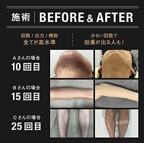 メンズサロンならではのノウハウを詰め込み、業界最大クラスの100万発照射と冷却機能を搭載。痛みを抑えながら全身ケアできるとして、口コミでも高い評価を得ています。