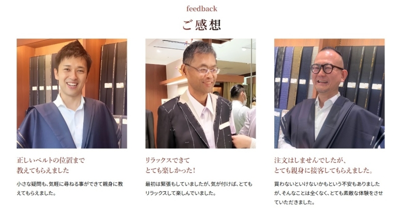 流行を追いすぎないデザインのため、何年経っても違和感なく着られるという声があります。結果的にコストパフォーマンスが良いと感じる人もいます。 - 接客が落ち着いていて信頼できる