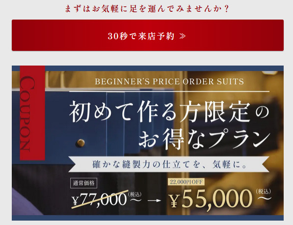 - スーツは税込55,000円〜と、オーダースーツとしては比較的手頃な価格帯で用意されています。