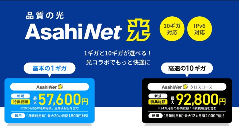 新規契約で最大57,600円分の割引やキャッシュバックが受けられます。 - クロスコース(10ギガ)