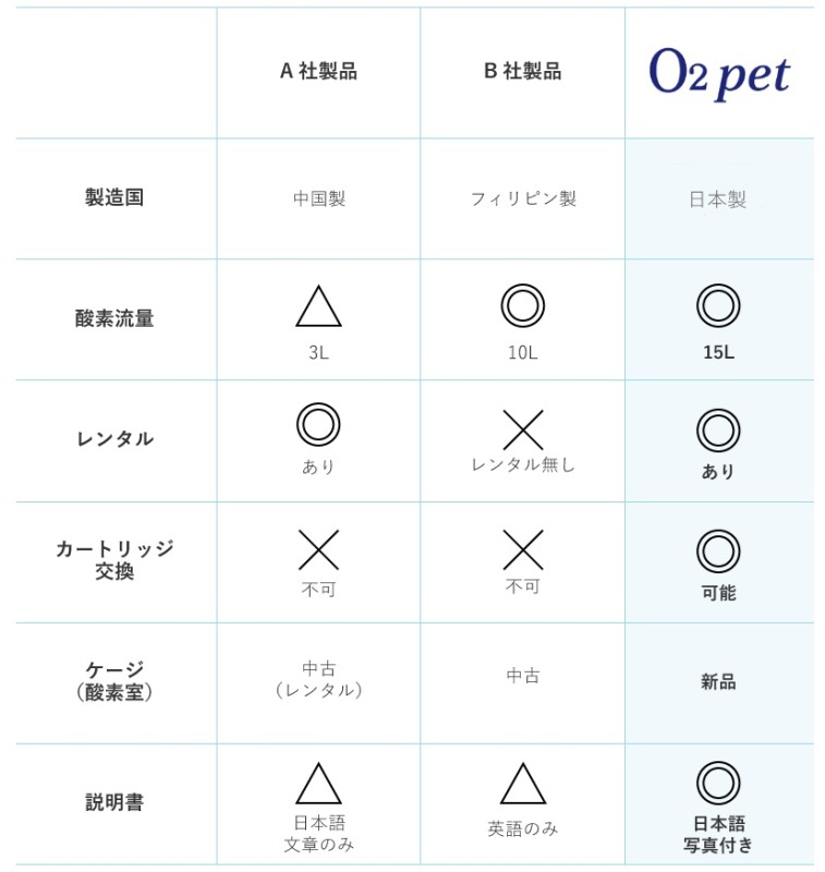比較項目 | オーツーペット | 他社A社 | 他社B社 |