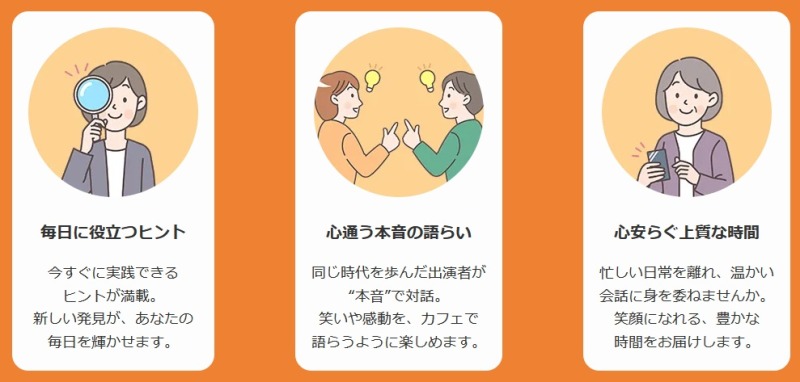 たとえば『人生100年!大人カフェ』では、健康・暮らし・人間関係などをテーマにしたトークを通して、毎日の生活に役立つヒントが得られます。
