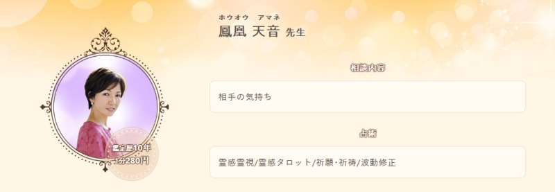 鑑定歴:10年/料金:1分280円/主な相談:相手の気持ち