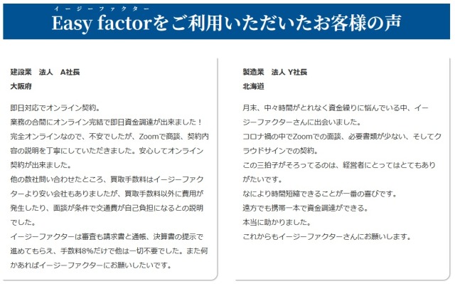 イージーファクターの口コミでは、「スピードが早い」「担当者が親切」「手数料が安い」など、利用者からの満足度が高い声が多く見られます。