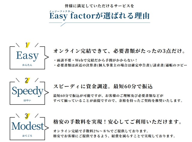 イージーファクター(Easy factor)は、「スピード」「手数料」「手軽さ」の3拍子がそろったオンライン完結型のファクタリングサービスです。