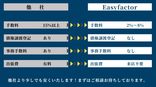 ファクタリング会社は多数ありますが、イージーファクター(Easy factor)は「手数料の安さ」「スピード」「透明性」で大きく差をつけています。