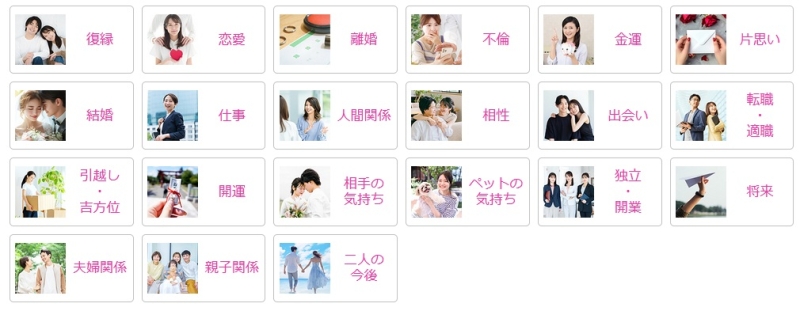 ここでは、公式サイトで実際に用意されている「お悩み別」「占術別」カテゴリーを紹介します。