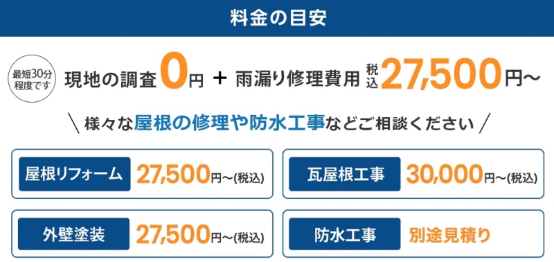 雨漏り修理110番の料金は、全国どこでも見積無料&現地調査0円。