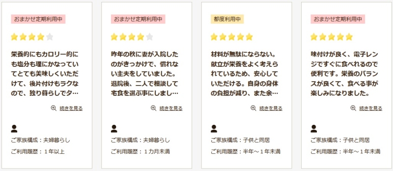 口コミを総合すると、「健康を意識しながらも手軽さを求める人」に特に向いている宅配惣菜といえます。