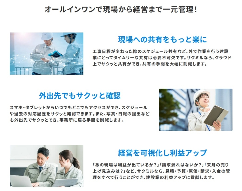 サクミルは、工程・作業予定・職人や社員のスケジュール・見積・原価・写真・日報など、現場業務に必要なあらゆる情報を一元管理できるサービス。
