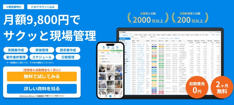 同様の建設業向け管理ツールの多くは、初期費用数万円〜十数万円、月額1万円以上が一般的です。