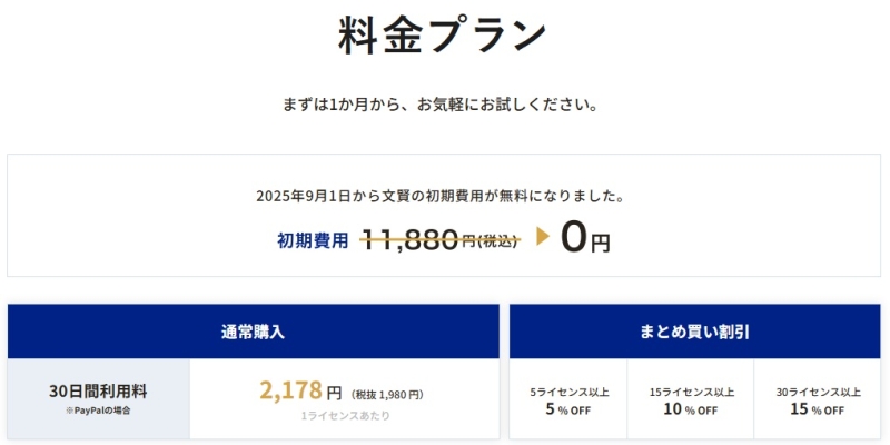 - 1ライセンスあたり 30日利用料:税込2,178円(税抜1,980円) です。