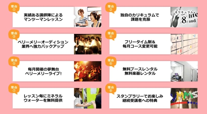 ベリーメリーには、「ただ通うだけ」のボイトレスクールにはない、他に代えがたい強みが複数あります。以下に代表的な「8つの強み」を整理しました。
