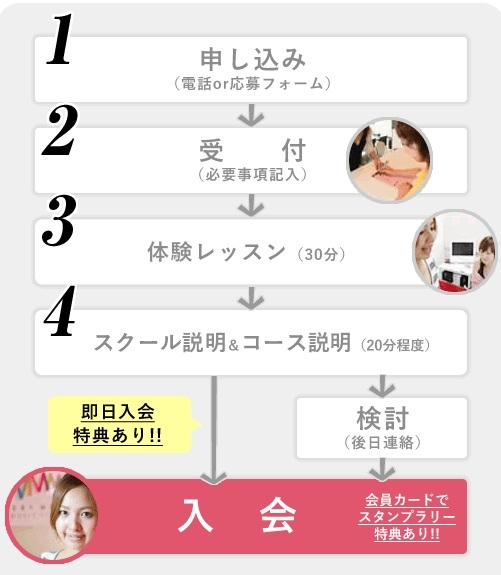 無料体験レッスン専用フォーム、または電話で申し込み可能。希望校舎・日時を提出すると、スタッフが日程調整を行います。
