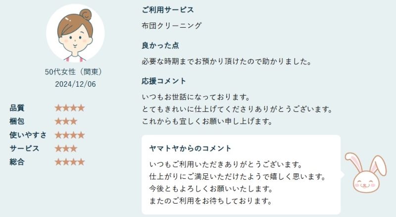 長期間保管してもらえるため、シーズンオフの衣類や布団を自宅で管理しなくて済んだという口コミがあります。 - 仕上がりが丁寧で安心感があった