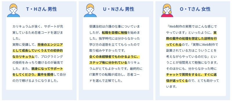 忍者CODEを検討している方の多くが気になるのが、実際に受講した人の口コミや評判ではないでしょうか。
