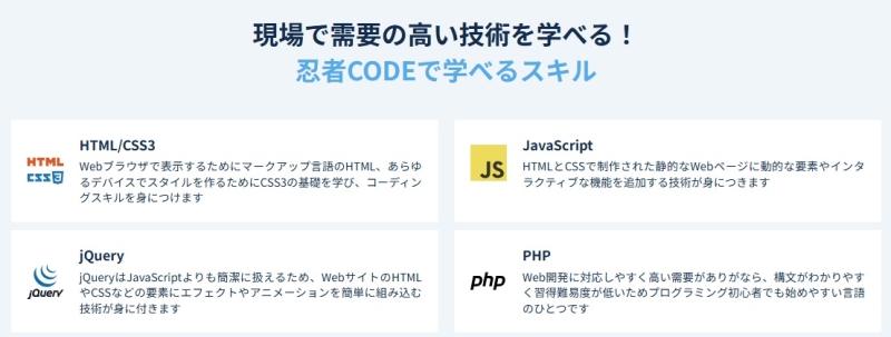 忍者CODEでは、Web制作やWebサービス開発の現場で使われることが多い技術を中心に、段階的に学べる構成が用意されています。