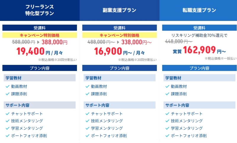 いずれのプランも、動画教材を中心とした学習に加え、チャットサポートやメンタリングなどの支援が含まれている点が特徴です。