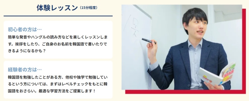 韓国語学習を前向きに検討しているのであれば、まずは体験レッスンを通して、自分に合うかどうかを確かめてみるのも一つの選択肢といえるでしょう。