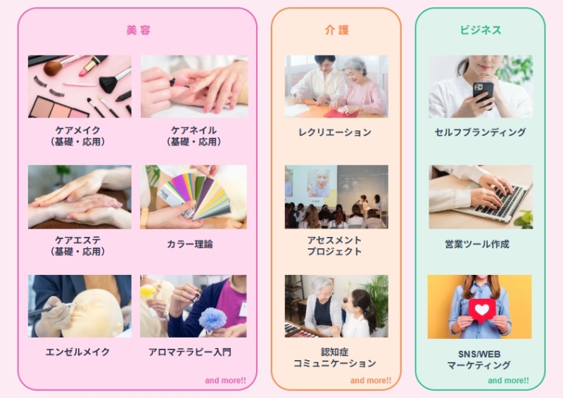 介護や看護、美容といった既存の経験を活かしながら、高齢者の生活や心に寄り添う新しい働き方を学べる点が特徴とされています。