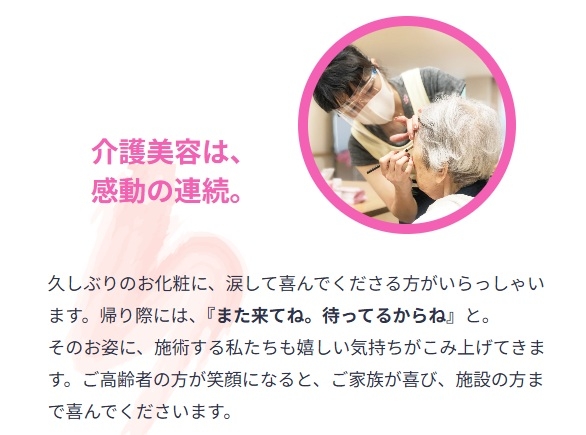 介護美容の現場では、久しぶりにお化粧をした高齢者が涙を流して喜ぶ場面や、