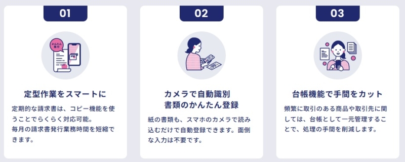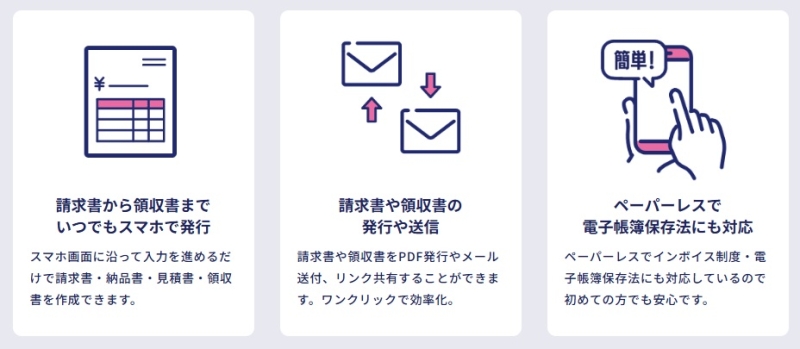 請求書・見積書・納品書・領収書の作成から送付、管理までを一つのアプリ内で行えるため、日々の事務作業をできるだけシンプルにしたい人に向いています。