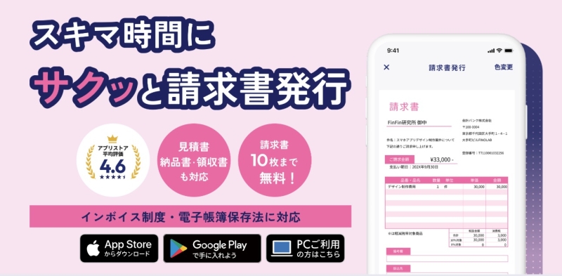 そんな中で注目されているのが、スマホだけで請求書や領収書の発行・送付まで完結できる「スマホインボイス FinFin」です。