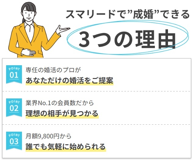 この記事では、スマリードの口コミ・評判をもとに、サービスの特徴や成婚率の理由、料金の考え方、無料オンライン相談から成婚までの流れまでを詳しく解説しますので参考にしてください。