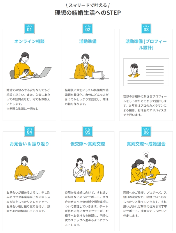 スマリードの大きな特徴は、「オンライン型でありながら、戦略的に成婚まで導く設計がされている」点です。単に出会いの場を提供するだけではなく、活動開始から成婚までのプロセスが段階的に組み立てられています。