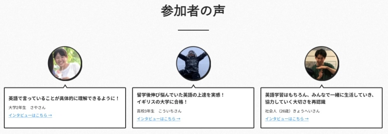 授業中心ではなく“使う環境”に身を置けるため、自然と英語で話す機会が増えたという声が多く見られます。完璧な文法よりも「まず話してみる」経験が自信につながったという評価が目立ちます。 - 短期間でも成長を実感できた