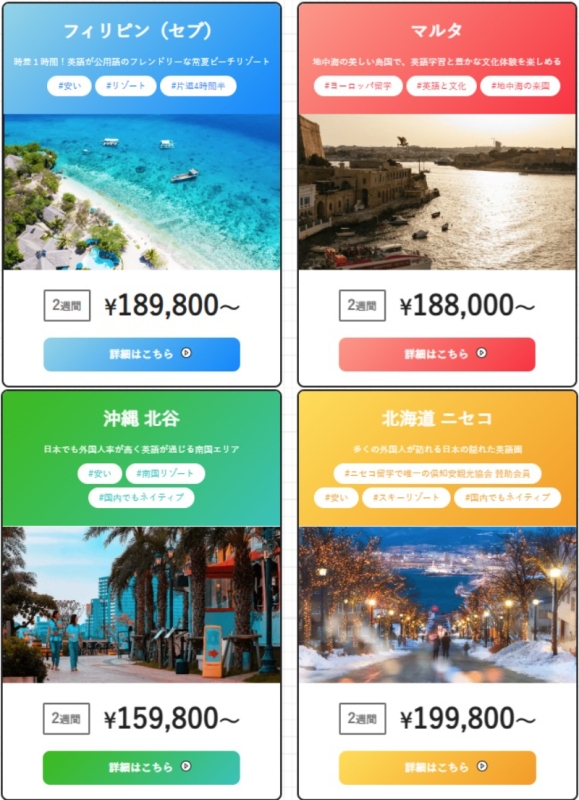 フィリピンやマルタでの海外留学はもちろん、沖縄やニセコといった国内拠点まで用意されているため、自分のレベルや状況に合わせて挑戦できるのも魅力です。