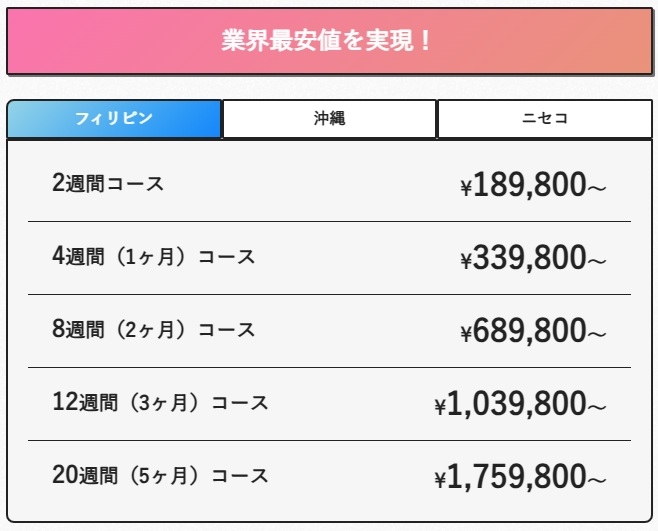 これらが含まれていることを考えると、単なる語学スクールとは比較しにくい内容です。
