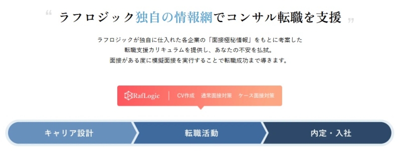 ラフロジックは総合型エージェントとは異なり、コンサル転職に特化しています。戦略系・IT系・総合系それぞれのファームに合わせた対策を行えるのが特徴です。