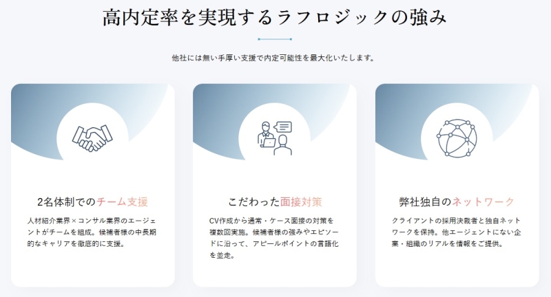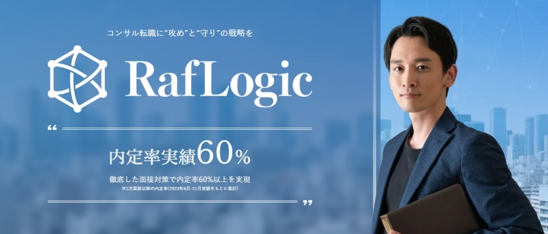 ラフロジックは、元デロイト・PwC出身のアドバイザーが支援するコンサル特化型エージェントとして注目されています。さらに、内定率60%と公表されている点も気になるポイントでしょう。