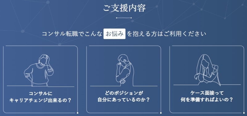 特に未経験からコンサルを目指す場合、「何をどう答えればよいのか分からない」という不安を抱える人も多いでしょう。その不安を具体的な対策で解消できる点が、口コミで高評価を得ている理由の一つといえます。