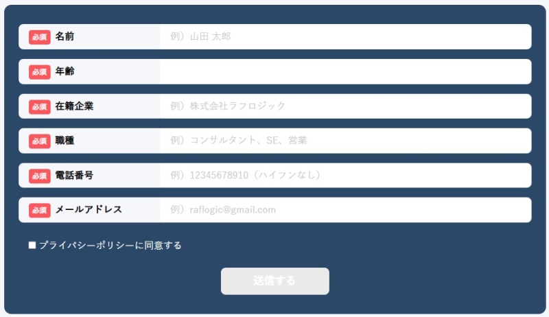入力項目は、名前・年齢・在籍企業・職種・電話番号・メールアドレスなどの基本情報のみ。複雑な登録や書類提出は不要で、数分あれば完了します。