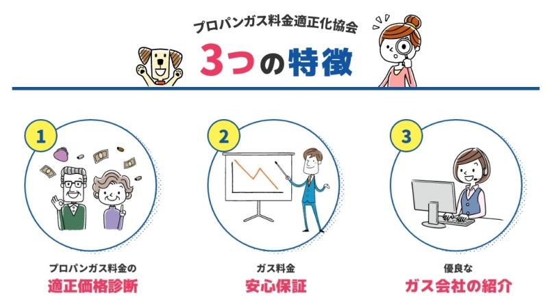 プロパンガス料金適正化協会の3つの特徴|料金診断・保証・紹介の仕組み