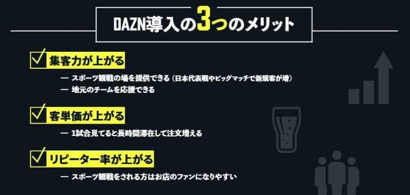 そんな中で注目されているのが、店舗向けスポーツ配信サービスであるDAZN for BUSINESSです。サッカーや野球などの人気コンテンツを店内で放映することで、「滞在時間の延長」「注文数の増加」「常連化の促進」といった効果が期待できます。
