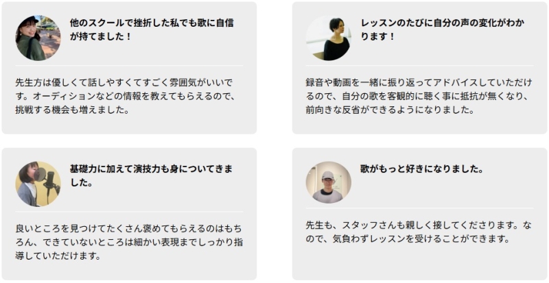 経験豊富な講師が多く、発声や表現の改善点を的確に指摘してくれる点が評価されています。 - 短期間でも変化を実感できた