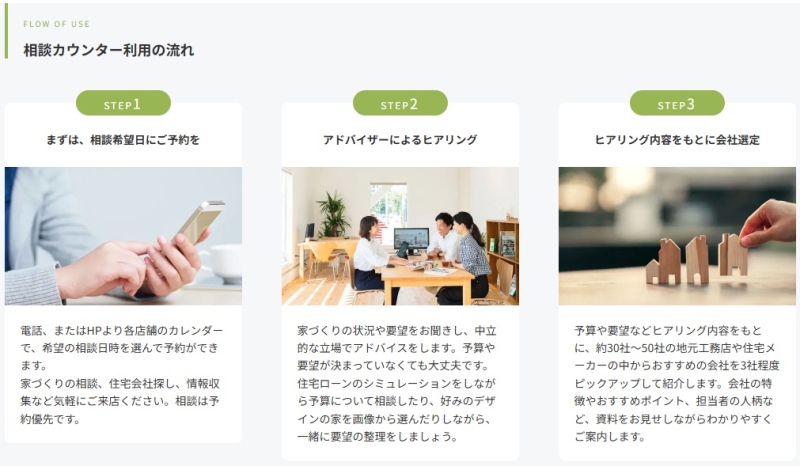 くふうイエタテカウンターは、複雑な手続きはなく、**シンプルな流れで無料相談を受けることができます。**事前に流れを知っておくことで、不安なく一歩踏み出しやすくなります。