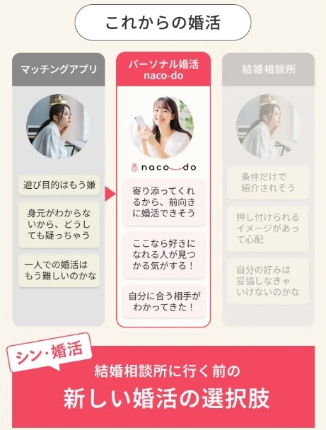 naco-doは、マッチングアプリと従来の結婚相談所の中間のような存在です。手軽さだけでなく、サポート体制があることで、より現実的な婚活が可能になります。