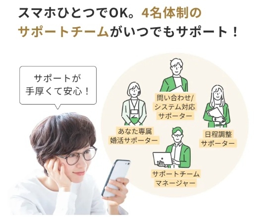 来店不要で始められる点が好評で、忙しい人でも無理なく婚活を続けられるという声が多く見られます。 - 専属サポーターのアドバイスが助かる
