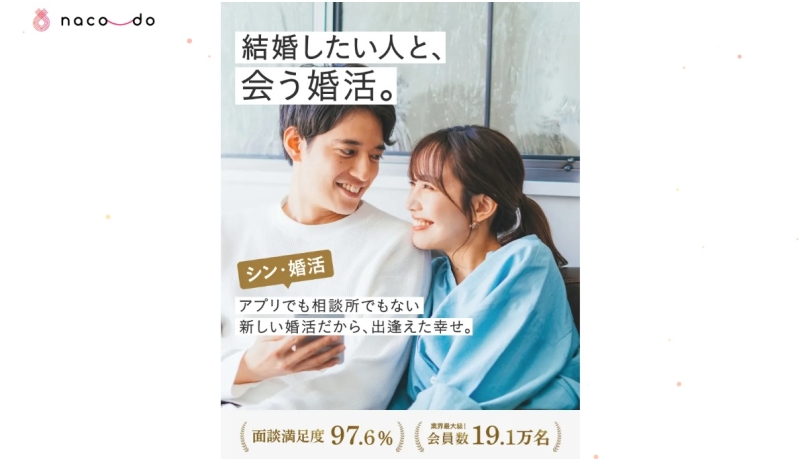 そんな中で注目されているのが、オンライン完結型の結婚相談所「naco-do」です。来店不要で始められる手軽さに加え、専属サポーターによるサポートや、成婚料0円という料金設計など、これまでの結婚相談所とは異なる特徴を持っています。