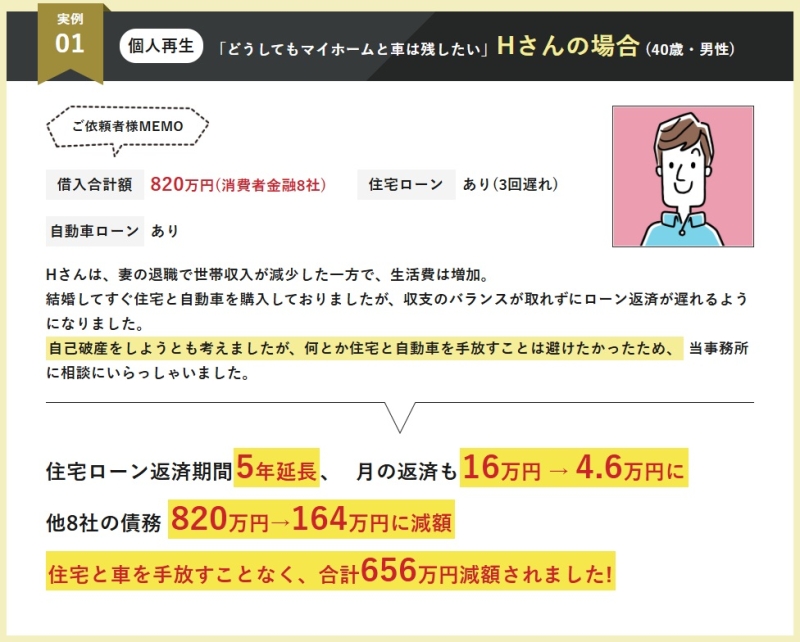自己破産も検討されたものの、「どうしても自宅は残したい」という希望があり、個人再生という方法を選択しています。