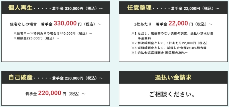 - 任意整理:1社あたり着手金 約22,000円(税込)〜