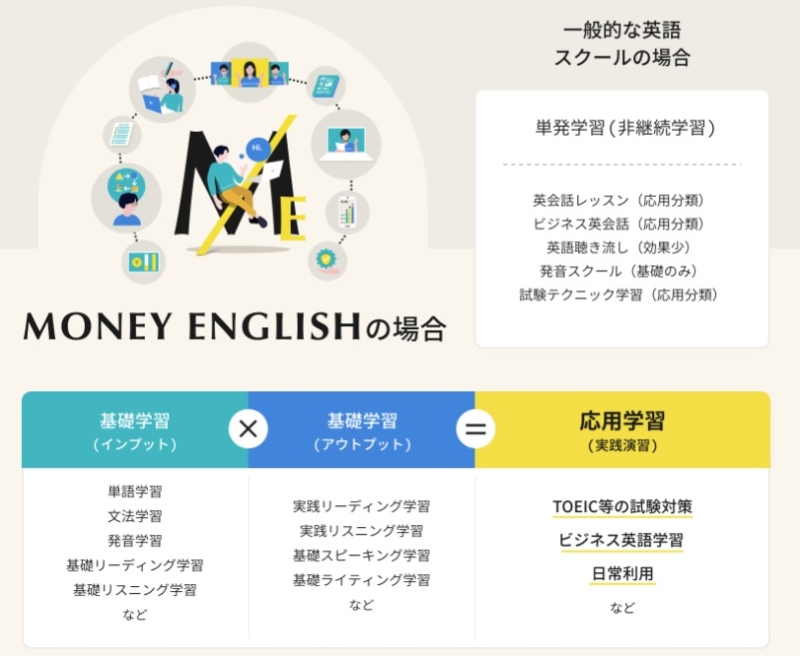 マネーイングリッシュでは、いきなり会話練習に入るのではなく、まずは土台となる基礎力を重視した学習からスタートします。