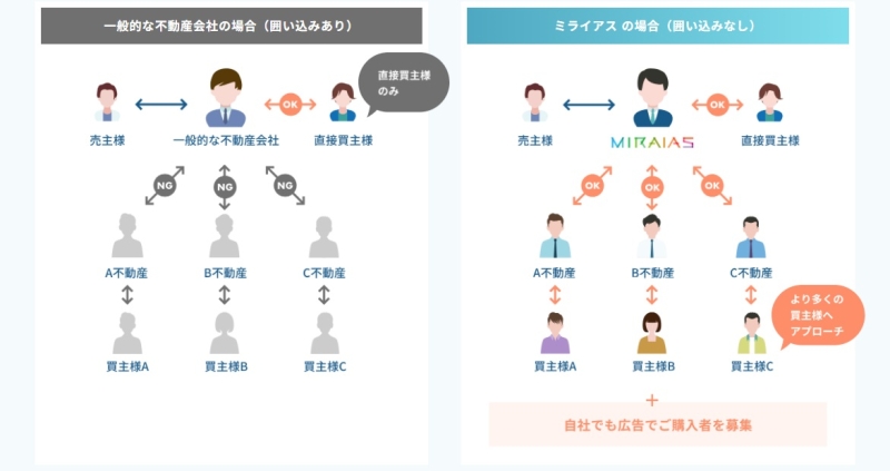 このようにミライアスは、従来の不動産仲介で起こりがちな「売れない」「安くなる」といった不安に対して、仕組みからアプローチしているサービスといえます。